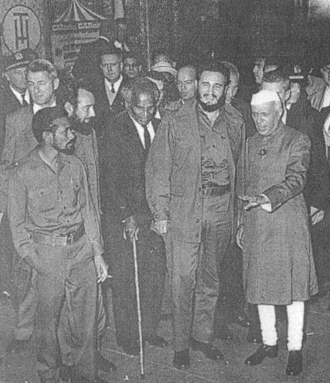 Suzanne: In September 1960, when Castro arrived in New York, the fine hotels of Manhattan refused to host him. It was Harlem, the Black ghetto of New York, that housed Fidel and his delegation. Each night crowds of up to ten thousand Spanish-speaking and Black people gathered before the Hotel Theresa to cheer them. (In photo, from left: Gen. Juan Almeida; Krishna Menon, Ambassador of India to United Nations; Fidel Castro; Indian Prime Minister Jawaharlal Nehru, outside the Hotel Theresa.)