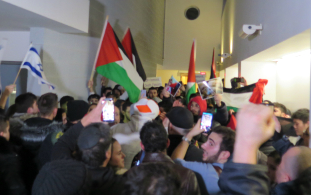 The stated purpose of the gathering was to discuss “the current climate faced by Jewish students on campus” – a formula routinely used to introduce condemnation of students advocating human rights for Palestinians. Yet the meeting was challenged not by friends of Palestine, who scrupulously respect the rights of pro-Israel students and activists, but by a Zionist group notorious for expressing its hostility to Palestinian rights through extremism and violence.