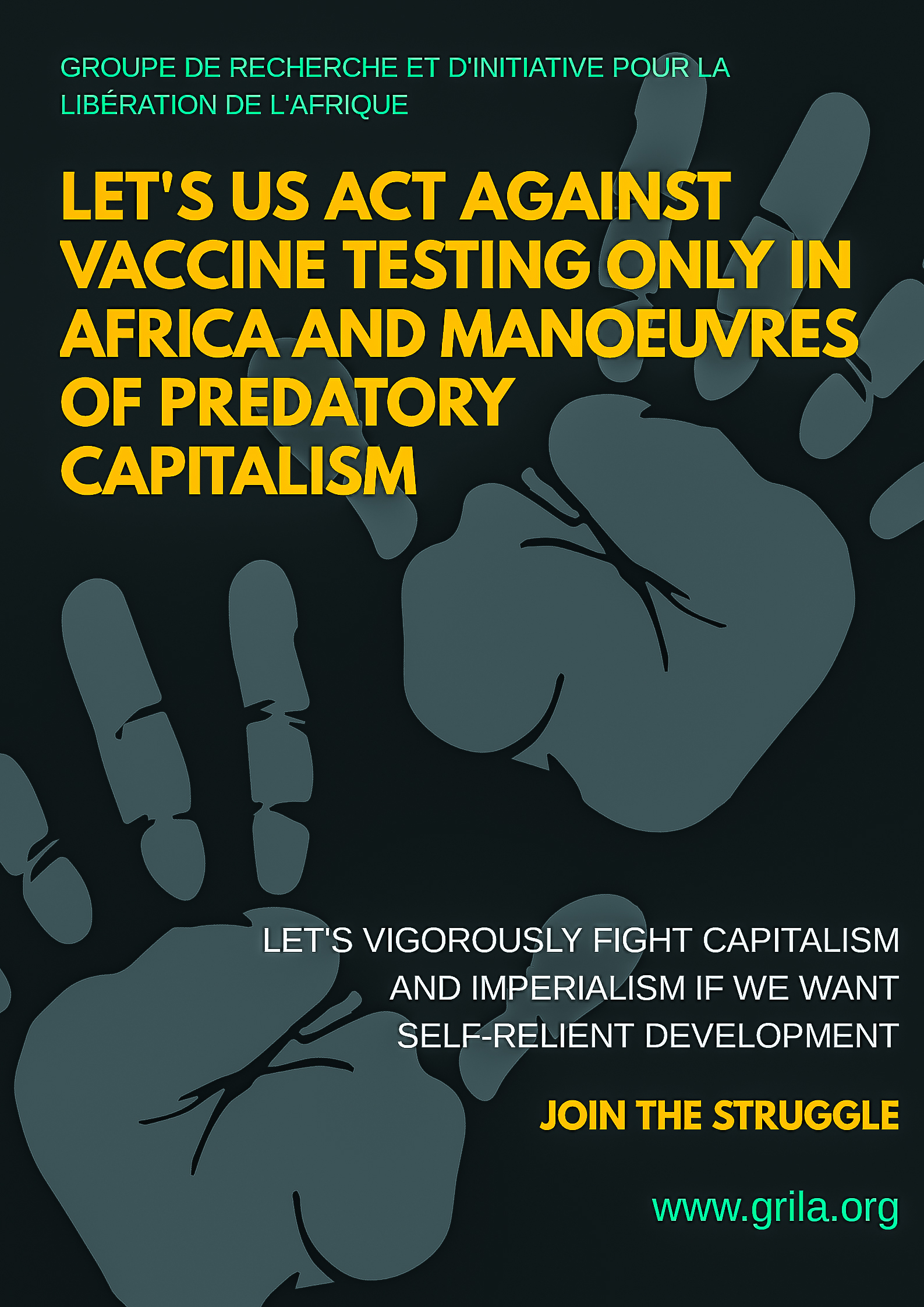 Poster prepared by GRILA chapter in Kinshasa (Democratic Republic of the Congo) warns against corporate “snake-oil salesmen” seeking to victimize Africans as guinea pigs for vaccine testing. Testing should be done with caution in “epicenters in Asia, North America, and Europe,” GRILA says.